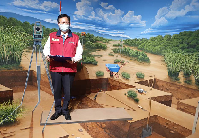 桃園市長鄭文燦視察大園尖山考古展示館,宛如置身考古發掘現場的探坑3D彩繪,為館內最佳拍照打卡點