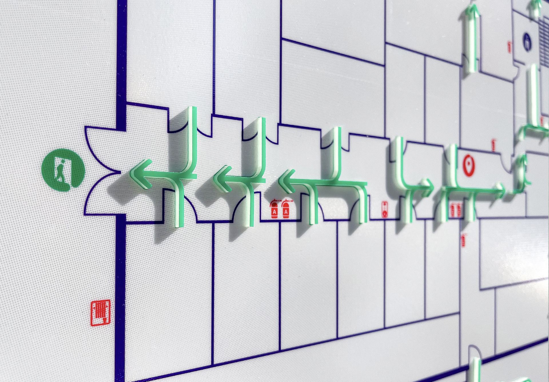當災害發生時,以「立體化」、「動線強化」、「辨識度高」為核心,協助使用者在緊急時刻能快速判斷方向、爭取自行或協助他人逃生黃金時間。