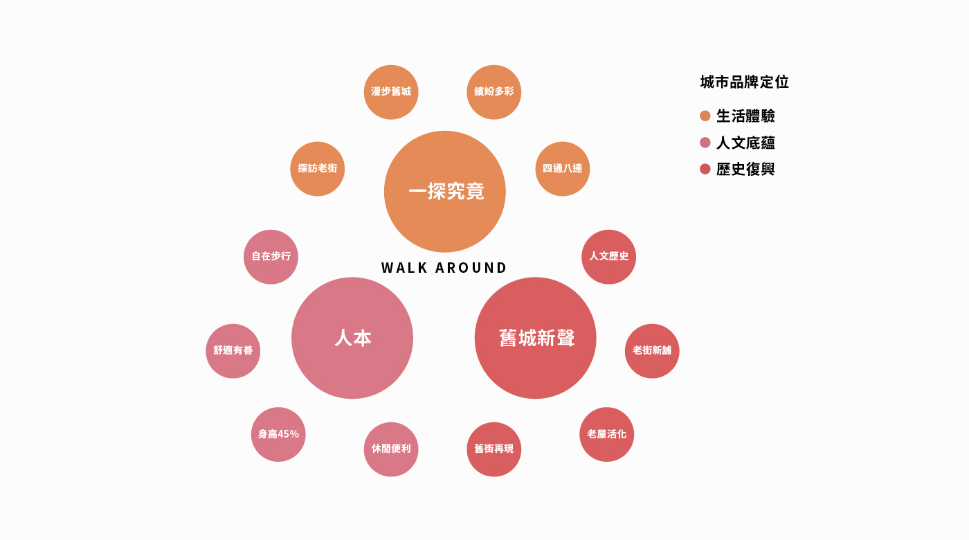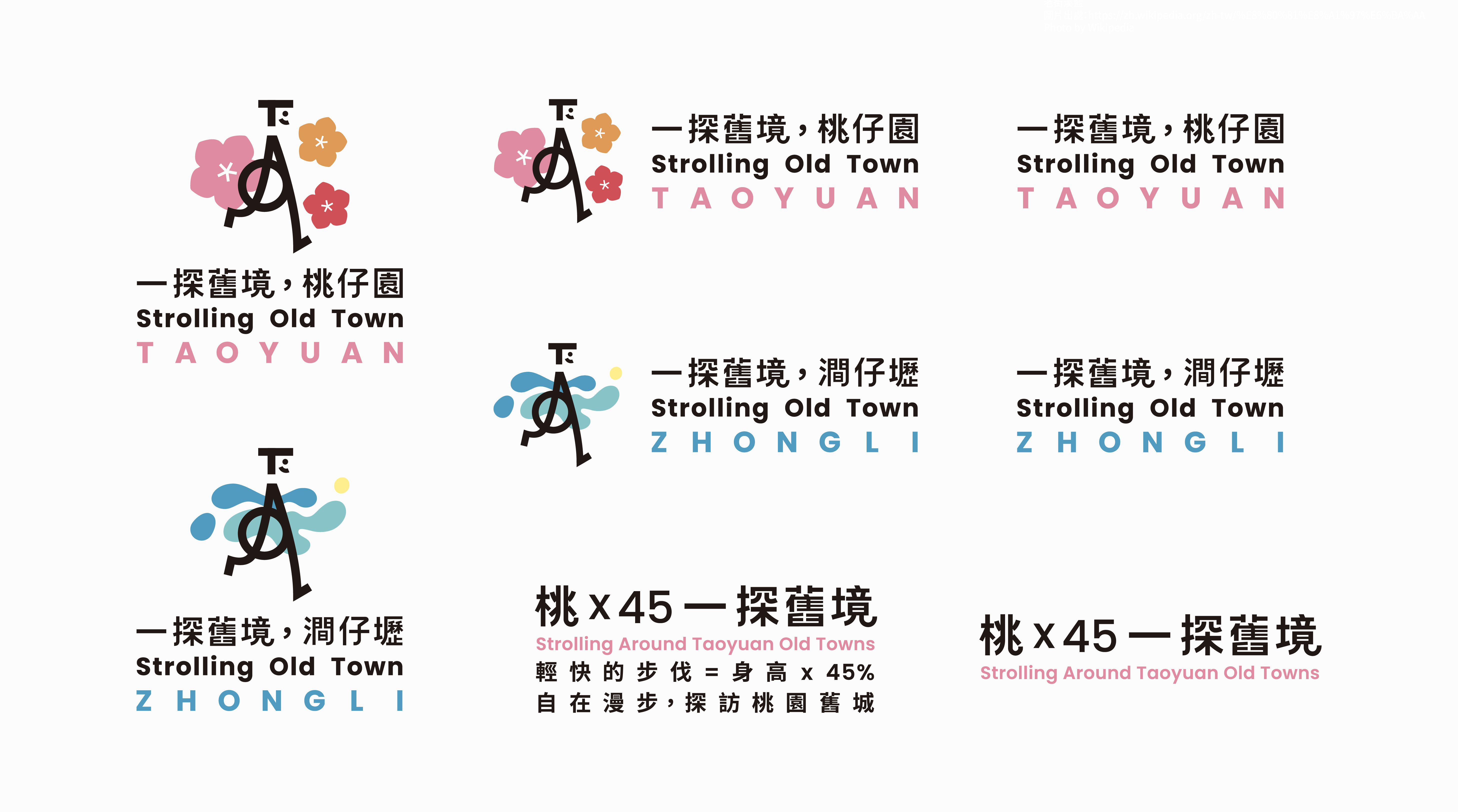 Taoyuan( 桃園) 裡的TAO 化身為輕快行走的人形象,主視覺亦可靈活搭配城區特色。舊城再生,邀請邀請大家以輕快的步伐來桃園一探究竟,回流舊城區,再現舊城風華。