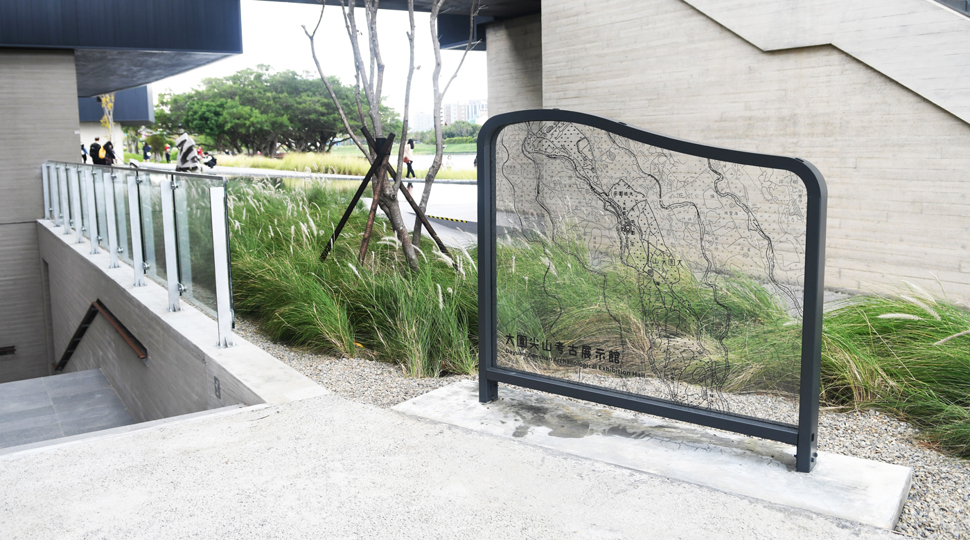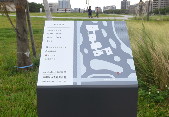 以沈穩的灰色系及古地圖為視覺主軸,配合大園尖山考古館整體建築色調風格,營造出館舍歷史與內涵豐富的特色,並具清楚引導遊客觀賞動線之功能。