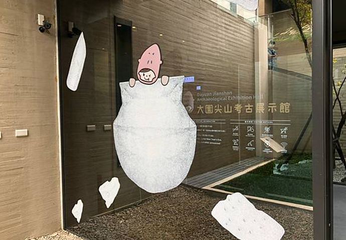 大園尖山考古展示館空間位於B1,希望入口意象有導引意象與考古館文化內涵的設計吸引民眾走下階梯參觀。設計方向帶入館內的標準VI Design企業識別系統,並結合考古展示館的初衷帶領著孩童學習與探索的精神。以童趣的設計風格搭配橫山書法藝術館的日式禪風外觀、清水模風格建築,讓整體視覺意象與建築風格相輔相成。